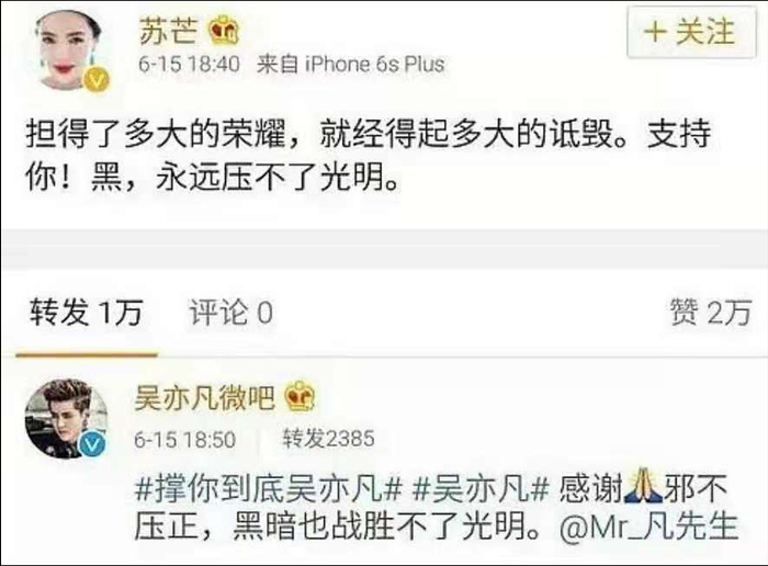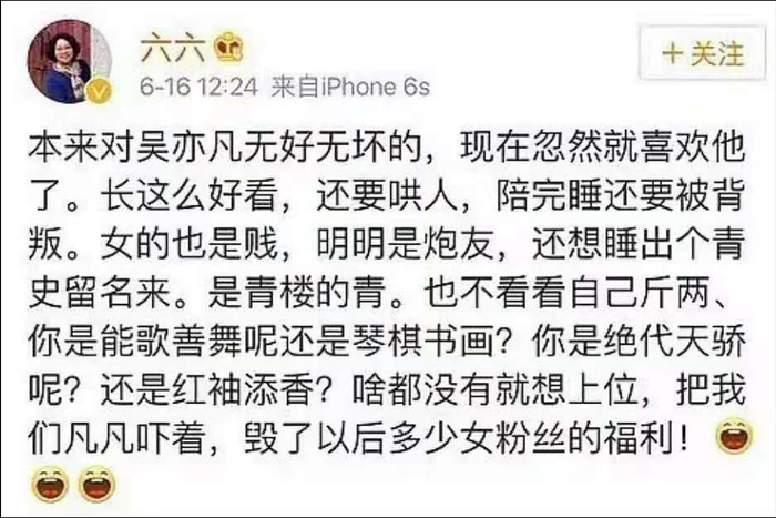 而马薇薇、六六和苏芒则在当时公开支持吴亦凡,马薇薇更是发表了“还有比明星x粉更好的粉丝福利么?”的不当言论。