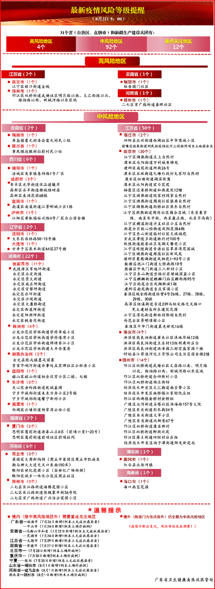 《通知》还倡导市民非必要不到中高风险地区,非必要不出省,非必要不出境,并提醒市民近期出差、旅游归来,应密切关注自身及家人的身体状况,如出现发热、干咳、乏力等可疑症状,要佩戴口罩及时到附近医院发热门诊就医,不要带病上班,并向单位报告旅行史、接触史及身体异常情况。