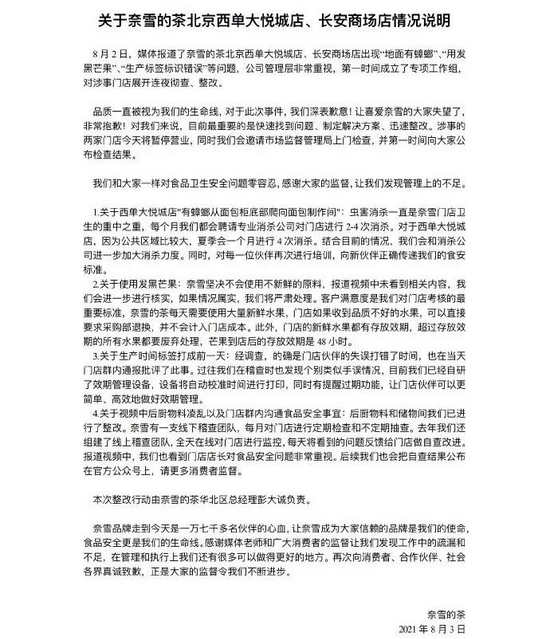 8月4日,奈雪的茶官方微博发布消息称,各地政府监管部门已对全国186家门店(全部店数603家)突击检查,抽查结果合规合格,未发现有报道中提及的“地面有蟑螂”“用发黑芒果”“生产标签标识错误”等问题。