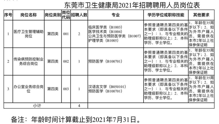 医疗卫生管理辅助岗位2人、传染病预防控制业务综合岗位1人、办公室业务综合岗位1人。其中2个医疗卫生管理辅助岗位用于东莞市卫生健康局,1个传染病预防控制业务综合岗位和1个办公室业务综合岗位用于东莞市疾病预防控制中心。具体岗位情况和要求见岗位表。