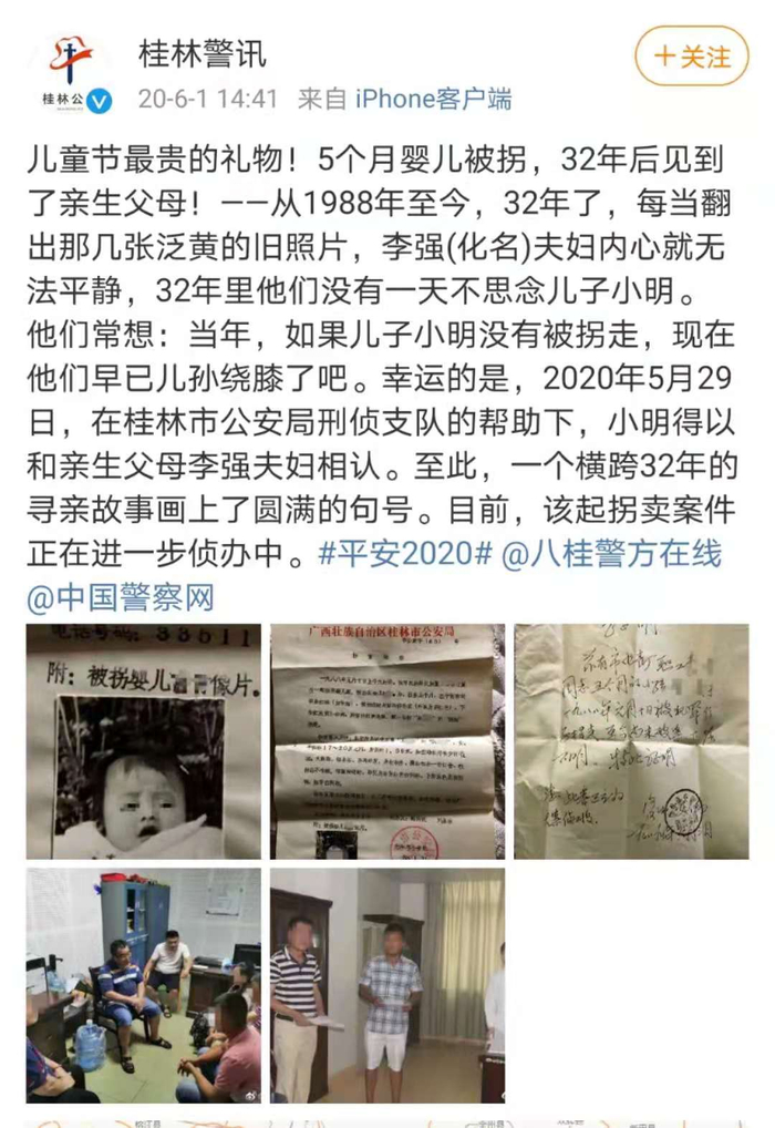 “2020年5月29日,在桂林市公安局刑侦支队的帮助下,曹平得以和亲生父母相认。至此,一个横跨32年的寻亲故事画上了圆满的句号。”桂林市公安局曾对外发布相关文章称。