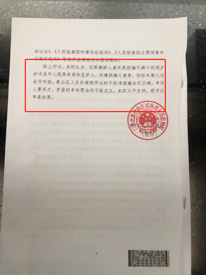 曹颖提供的《桂林市象山区人民检察院刑事申诉结果通知书》显示,申诉人曹某才、李某,系被害人父亲、母亲,不服该检察院不批捕涉嫌拐骗儿童的犯罪嫌疑人秦某英的决定,提出申诉。该院审查认为,犯罪嫌疑人秦某英涉嫌拐骗儿童罪,但因其犯罪已过追诉时效,该院不批准逮捕决定正确,申诉理由不能成立,现予审查结案。