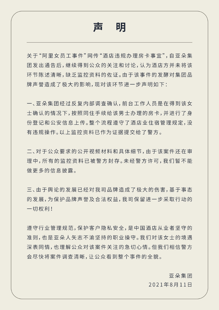 8月11日,亚朵酒店在微博上发布澄清声明,表示涉事酒店工作人员在该事件中操作流程规范,不存在违规制作房卡的情况。