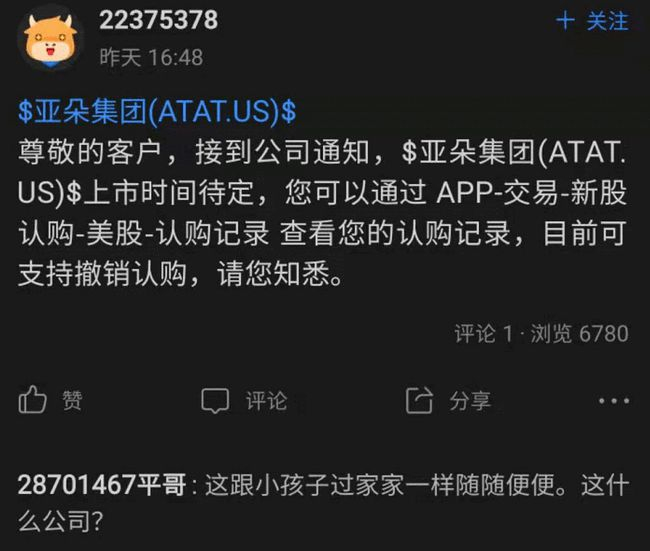 就在上述文章发出的同一日,6月30日下午,富途牛牛上陆续有网友爆料收到亚朵酒店上市时间待定的通知。