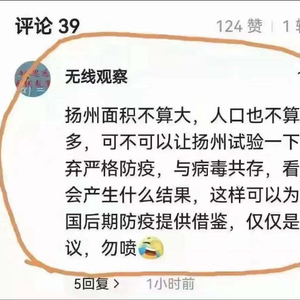 网传截图显示,“无线观察”此前在今日头条一文章的评论区留言称,“扬州面积不算大,人口也不算多,可不可以让扬州试验一下放弃严格防疫,与病毒共存,看看会产生什么结果,这样可以为全国后期防疫提供借鉴,仅仅是建议,勿喷。”