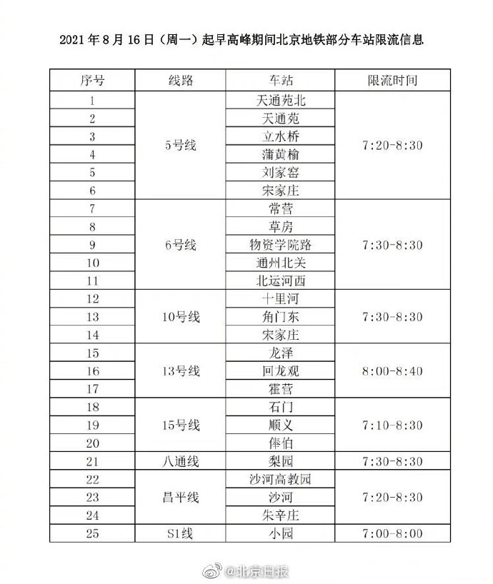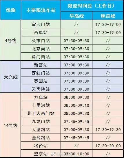 此前,地铁公布采取早高峰限流的车站包括:5号线天通苑北、天通苑、立水桥、蒲黄榆、刘家窑、宋家庄站,6号线常营、草房、物资学院路、通州北关、北运河西站,13号线龙泽、回龙观、霍营站,15号线石门、顺义、俸伯站,昌平线沙河高教园、沙河、朱辛庄站,4-大兴线天宫院、枣园、西红门、新宫、角门西、北京南站、菜市口、西单、宣武门站,14号线方庄、十里河、北工大西门、九龙山、大望路、金台路、将台、望京站。(@北京日报 记者 李博)