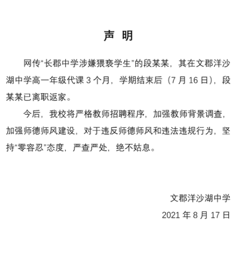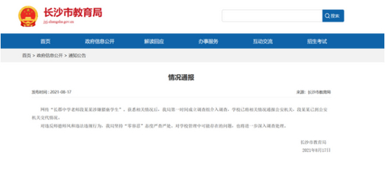 8月17日,长沙教育局作出回应:获悉相关情况后,教育局第一时间成立调查组介入调查,学校已将相关情况通报公安机关,段某某已到公安机关交代情况。