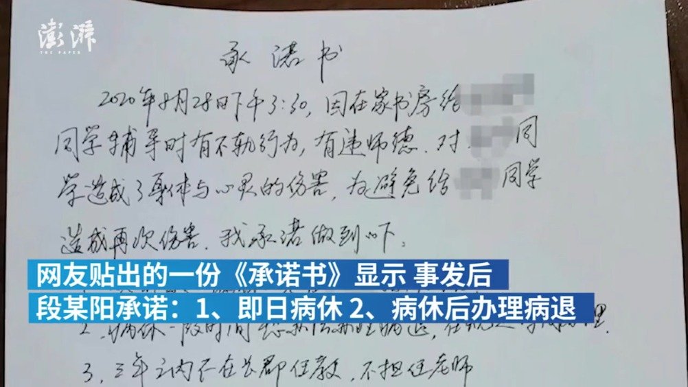 武汉晨报记者注意到,承诺书中,段某阳称,2020年8月28日下午3:30,自己因在家中书房给某同学辅导时有不轨行为,有违师德,对某同学造成了身体与心灵的伤害,为避免给某同学造成再次伤害,承诺做到以下。