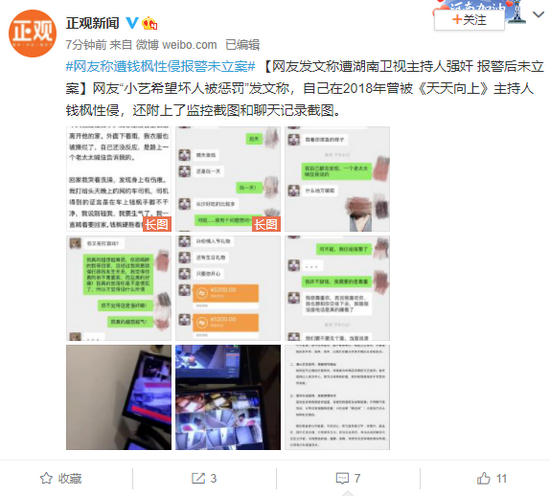 原标题:网友发文称遭湖南卫视主持人强奸 报警后未立案