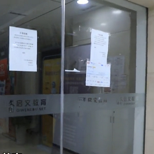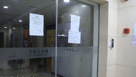 在启文教育宝山万达店,记者发现昏暗的楼道中只有一个保安坐在门前。门上张贴着告示称,启文教育已经启动破产清算,退费的家长可前往杨浦的总部咨询。