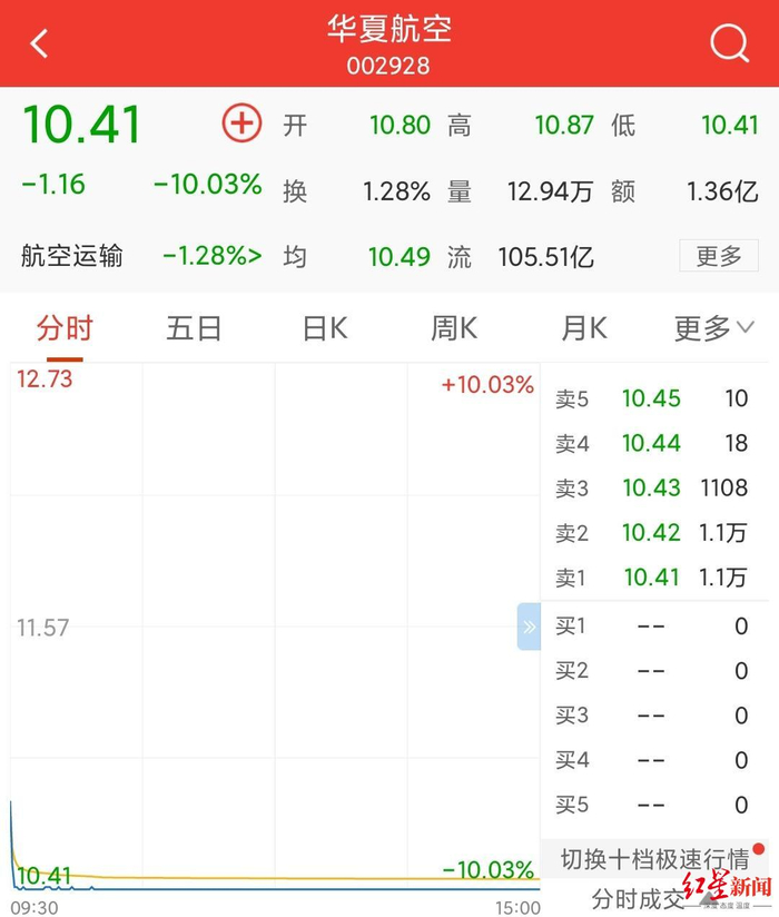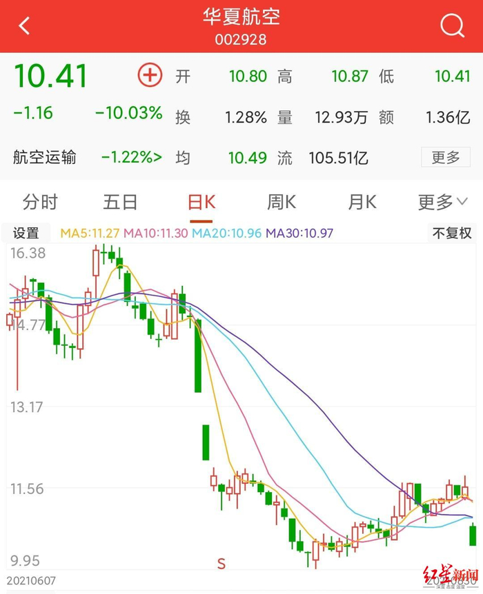 8月30日早间,华夏航空(002928.SZ)大幅低开后,3分钟内急速跌落至跌停板。红星资本局注意到,华夏航空股价在轻微波动后,至上午10:08被封死跌停。截至下午收盘,华夏航空仍躺在10.41元/股的跌停价上,总市值105.5亿元。