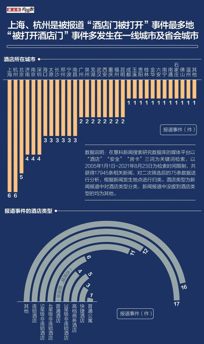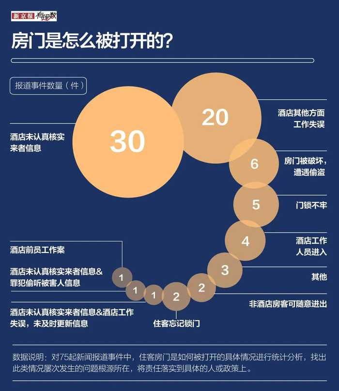 有理数检索了慧科新闻数据库2004-2021年关于“酒店房门被打开”的新闻,并通过人工筛选出75起符合“房门未经入住人同意被打开”这一特点的新闻事件,试图通过这些个案总结共性,进行反思:“隐私之门”被打开的背后,“房卡制作”是否存在违法违规操作?酒店安保、管理问题是否存在隐患?什么环境滋生了对行业的包庇和纵容?行业行规为何会成为一纸空谈?在强调酒店管理和行业监管体制之外,安全之困有什么新解决路径?