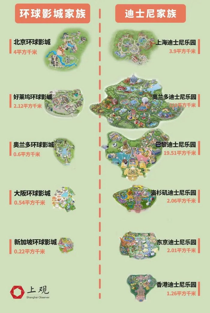 全世界最大的迪士尼乐园位于美国奥兰多,总面积达到111平方千米,足足有两个杨浦区那么大。而环球影城最大的北京项目,面积也仅4平方千米。