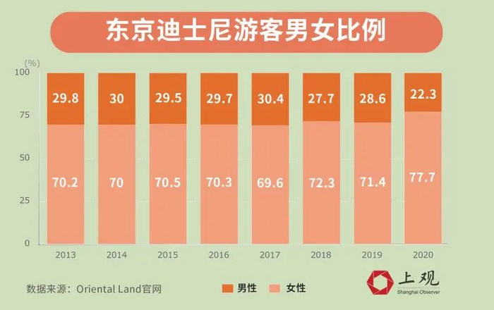 东京迪士尼曾披露过数据,近年来迪士尼游客群体男女比例为3:7,且女性游客比例逐年上升。也就是说谁抓住了女性游客的胃口,谁就能卖出更多周边,星黛露横空出世也顺应了这个道理。