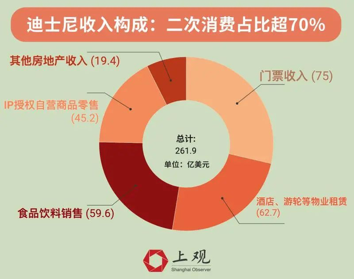 迪士尼2019财年门票收入为75亿美元,而二次消费却高达187亿美元,占到总收入的7成多。其中,IP授权开发和自营纪念商品收入为45.2亿美元。