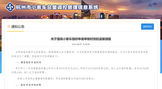 9月7日,杭州市小客车总量调控管理办公室发布《关于提高小客车指标申请审核时效的温馨提醒》。