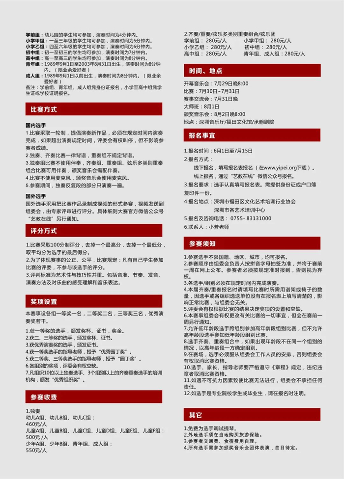 此外,独奏参赛费为460元-550元不等,齐奏、重奏、弦乐多类别重奏组合、弦乐团参赛费为280元/人。