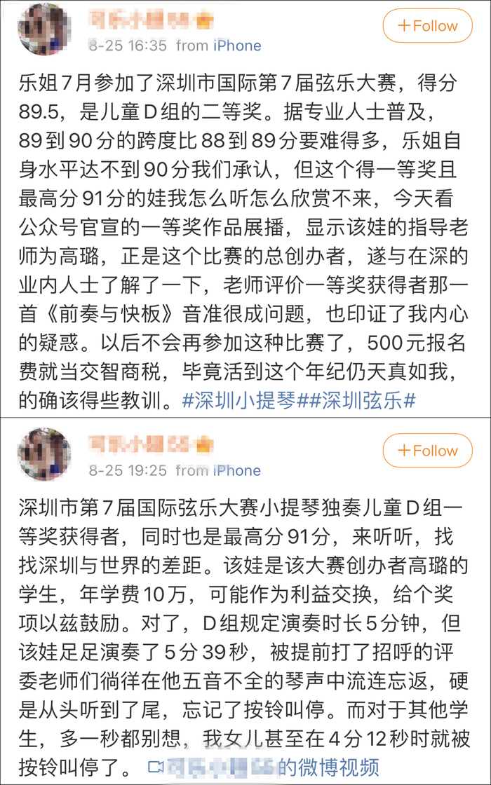 同日,一位自称小提琴独奏儿童D组二等奖获得者母亲的网友开始在多个社交媒体公开质疑称,与其女儿同组的一等奖获得者不仅演奏时长超过规定的5分钟没被叫停,“音准也很成问题”,并质疑获得一等奖的男孩的指导老师高璐(也是该比赛艺术总监)“为史上最水冠军做嫁衣”。