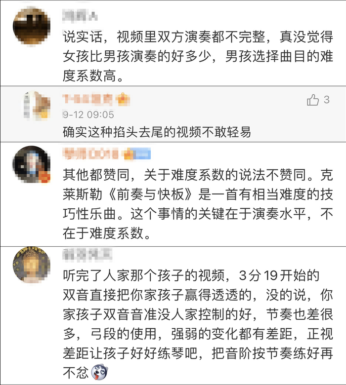 9月13日下午,自由音乐人、小提琴手韩舒凡告诉观察者网,两个视频“不具可比性”,“临场发挥基本占到一半甚至更高的比例”;两个小朋友的音准都有待提高,女孩的节奏感音乐性看似比男孩更饱满,但男孩右手发音(拉琴发音)却比女孩胜一筹。而且女孩家长发布的剪辑版视频“只截取了音最不准的一小段”。