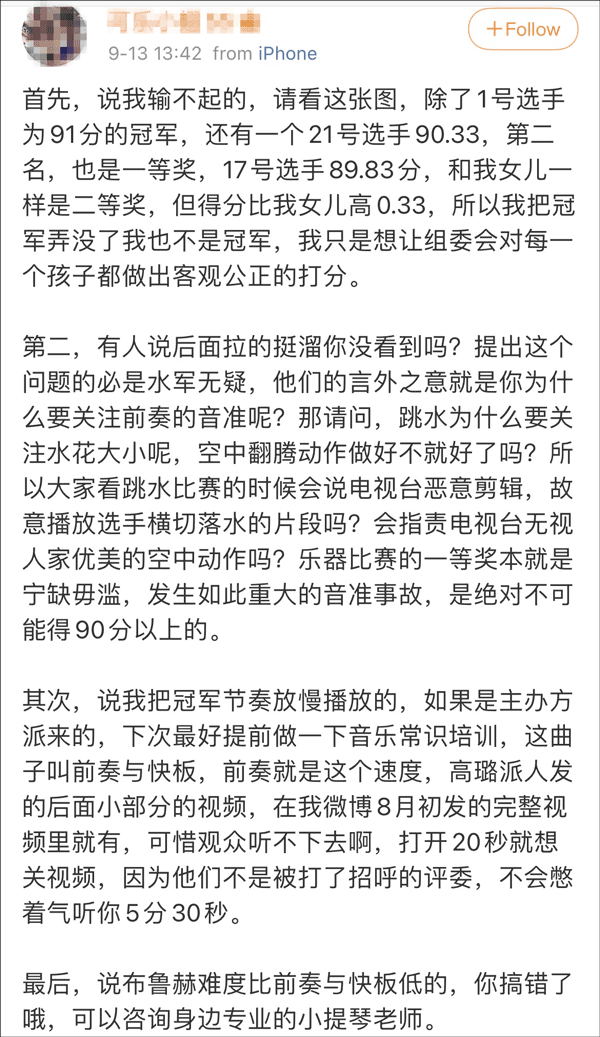 舆论进一步发酵后,该网友9月13日再度发文称,自己不是“输不起”,即使取消小男孩的一等奖,自己女儿也不是冠军,“我只是想让组委会对每一个孩子都做出客观公正的打分”,并坚持认为“乐器比赛的一等奖本就是宁缺毋滥,发生如此重大的音准事故,是绝对不可能得90分以上的”。
