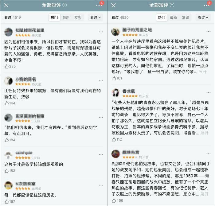 与此同时,国内唯一一部公映的抗美援朝纪录片《1950他们正年轻》也在大荧幕正式上映。26位平均年龄接近90岁的抗美援朝老战士,面对镜头口述了那段战火青春,给观众带来触动内心的震撼与共鸣。