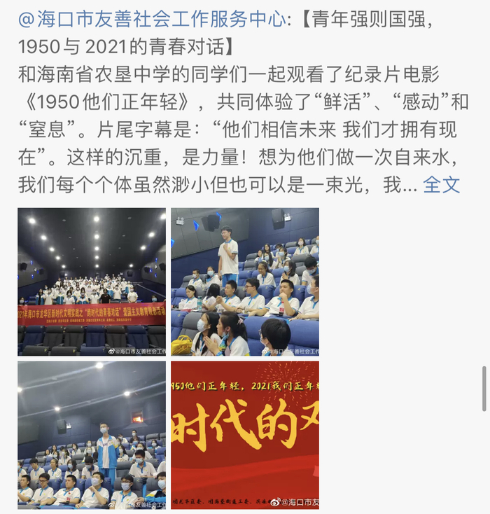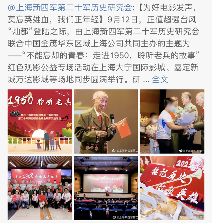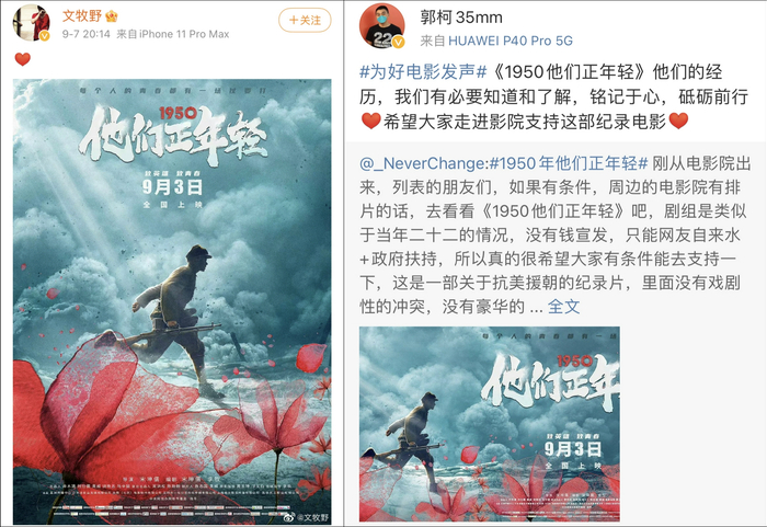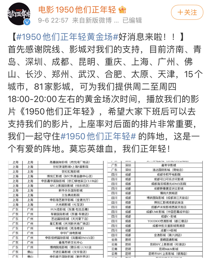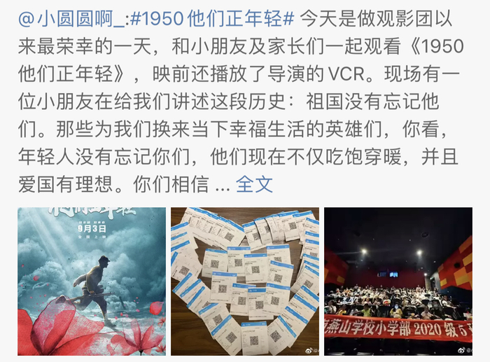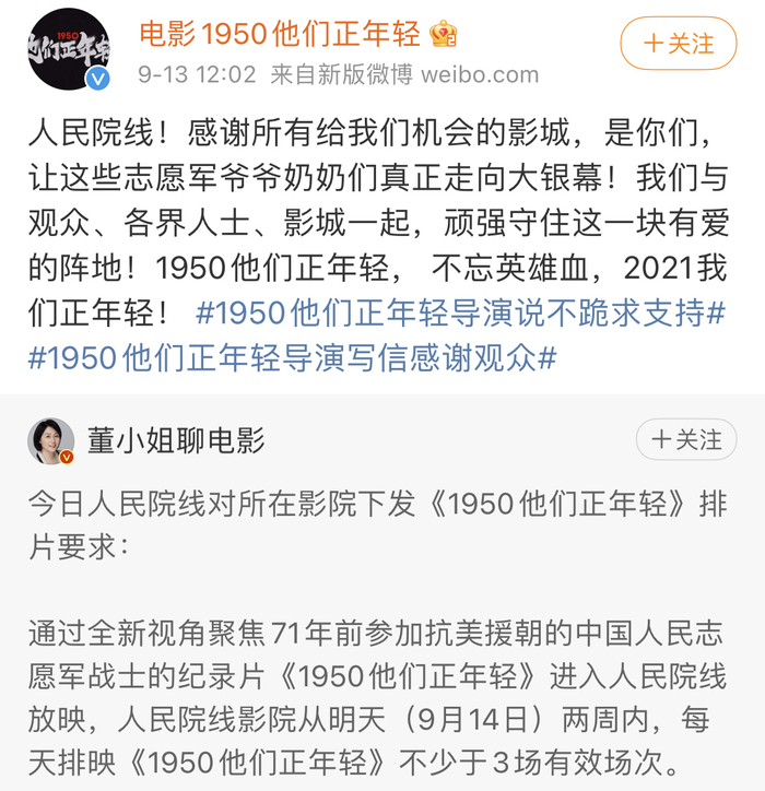 可喜的是,据@电影1950他们正年轻 消息,国家电影局下属的“人民院线”要求所在影院从14日开始的两周内,每天排映《1950他们正年轻》不少于3场有效场次。