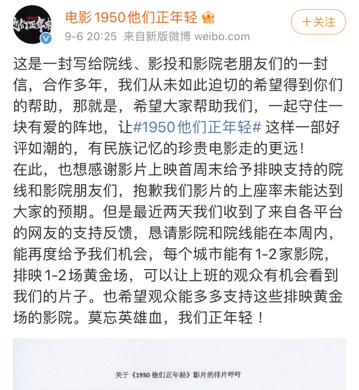 就在这封自白信发出后没多久,好消息传来——“人民院线”对所在影院提出排片要求,从明天(14日)开始的两周内,每天排映《1950他们正年轻》不少于3场有效场次。