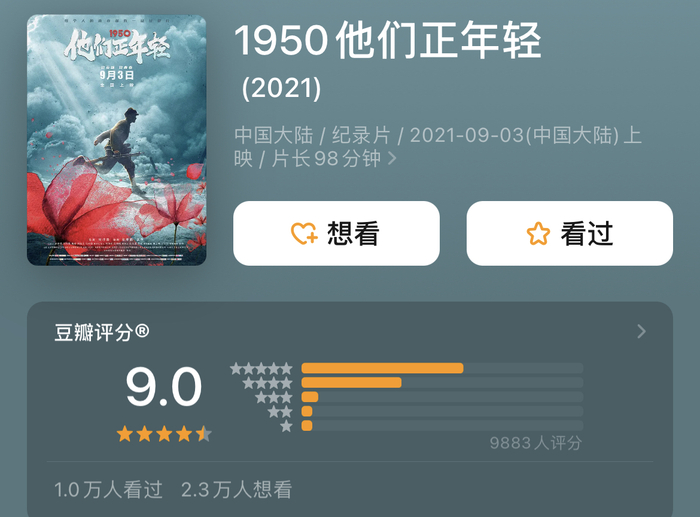 抗美援朝纪录电影《1950他们正年轻》中,26位志愿军老兵口述亲历战场的故事震撼人心,豆瓣评分高达9分。但受题材、体裁等各方面原因限制,自9月3日公映以来,该片票房至今不到500万,排片仅占1%。
