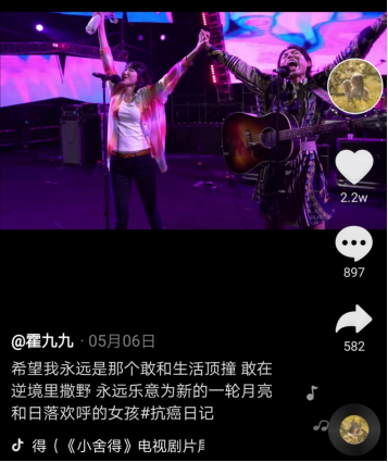 2020年6月19日,她在抖音上发布了第一条视频。她拍身上的纱布,对着镜头捏紧拳头,展示力量。她写道:“完成第五次抽胸腔积液2300ml。我曾有很多愿望,美好的爱情,无忧的生活,偶像的拥抱,现在我只想活着。”