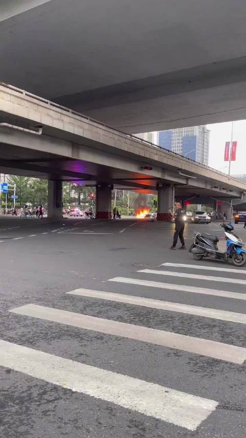 北京国贸桥下一小汽车自燃,无人员被困伤亡
