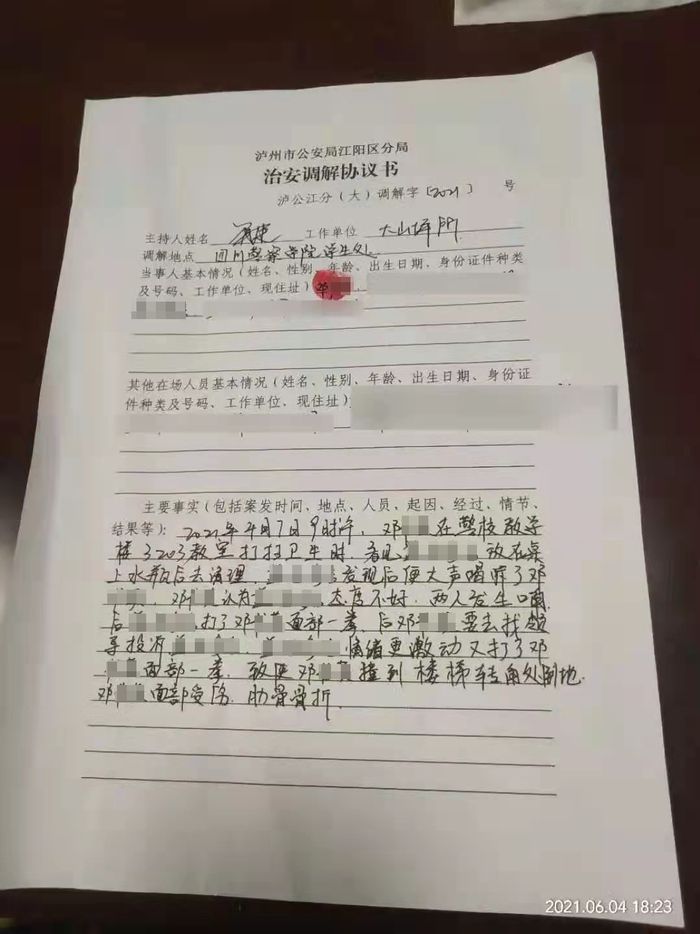 根据张某晒出的泸州市公安局江阳区分局出具的《治安调解协议书》显示,当天益某因饮料瓶一事呵斥邓某后,双方发生口角。益某先后打了邓某面部两拳,致使邓某撞到楼梯转角处倒地,面部受伤,肋骨骨折。