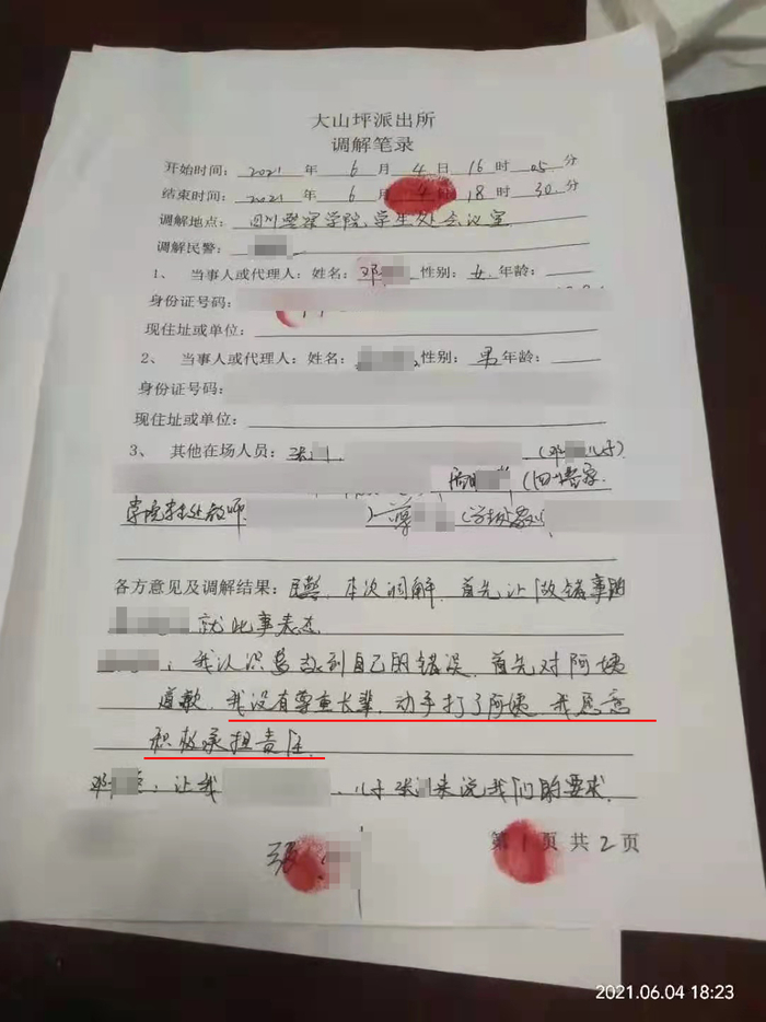 当天的《调解笔录》显示,邓某儿子张某、四川警察学院学生处的两位老师均在调解现场,打人学生益某当场向邓某道歉,并且承诺自己会积极承担责任。