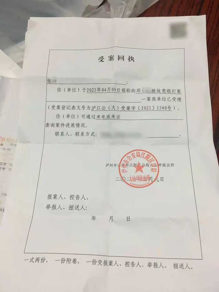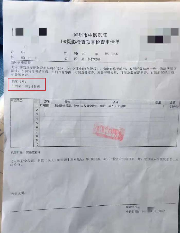 张某晒出的文件材料显示,4月9日,他就此事向泸州市公安局江阳区分局大山坪派出所报警;4月10日,泸州市中医医院开具DR摄影检查项目检查申请单,他的母亲邓某被诊断为“左侧第5-8肋骨骨折。”