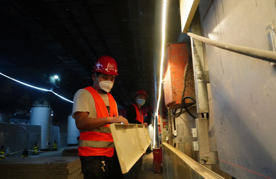 从施工竖井沿着楼梯往下走,进入车站内部,车站的站台层还处于“毛坯”状态,施工工人正忙着为车站铺设墙面。继续向下走,站台层已经完成了一整套“精装修”,白色的风格显得简洁大方。