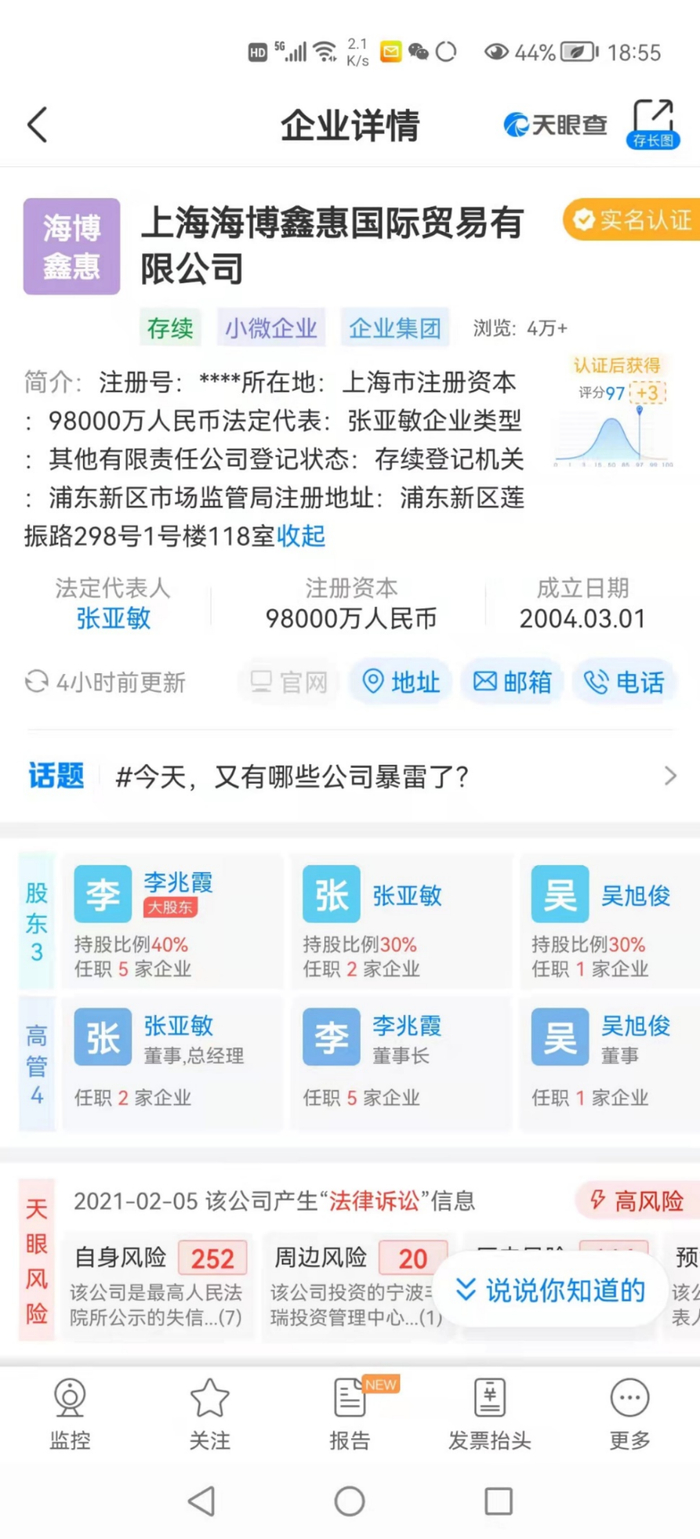 天眼查显示,上海海博鑫惠公司的大股东就是李兆会的妹妹李兆霞