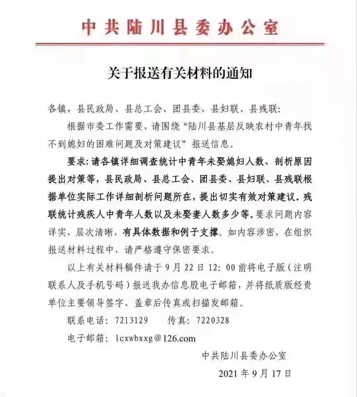 网川的《关于报送有关材料的通知》(以下简称“《通知》”显示:各镇,县民政局、县总工会、团县委、县妇联、县残联要围绕“陆川县基层反映农村中青年找不到媳妇的困难问题及对策建议”报送信息。
