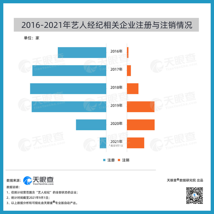 2014年起,我国艺人经纪相关企业(全部企业状态)的年度注册数量和增速骤然提升,2016年相关企业年注册增速高达99%,2018年新增相关企业数量超3000家,是历史增量最多的年份。以工商登记为准,截至8月27日,2021年我国新增艺人经纪相关企业同比减少73%,但仍有260家。另一方面,相关企业年注销量也增长明显,2019年和2020年,均有超1000家艺人经纪相关企业注销。