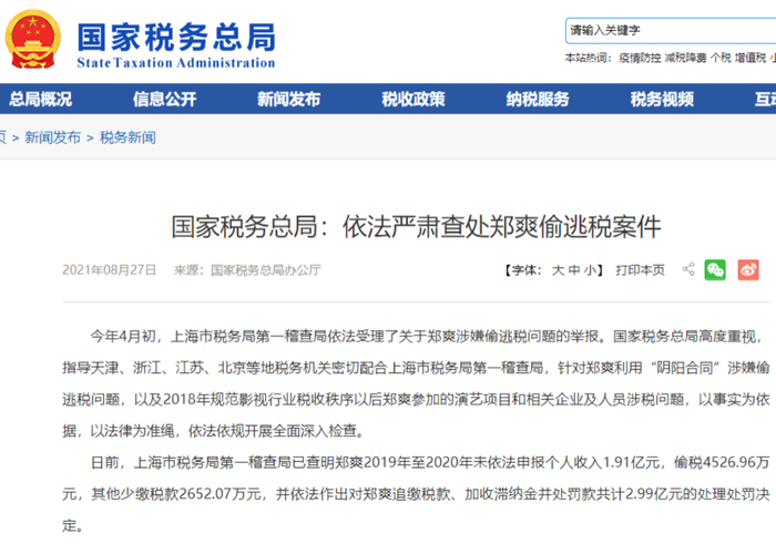 8月27日,国家税务总局、上海市税务局发布依法严肃查处郑爽偷逃税案件的情况,对郑爽追缴税款、加收滞纳金并处罚款共计2.99亿元。国家税务总局还表示,严厉查处和曝光各类恶意偷逃税行为,进一步规范影视行业税收秩序。