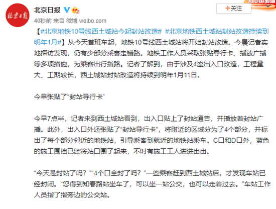 原标题:北京地铁10号线西土城站今起封站改造 北京地铁西土城站封站改造持续到明年1月