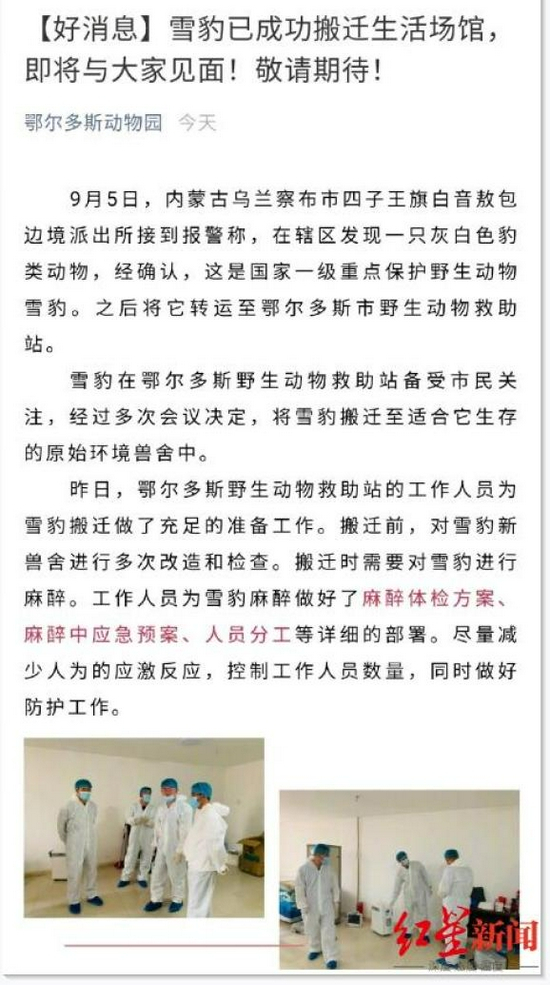 认证为科普作家的微博用户“花落成蚀”9月20日发布的截图显示,公众号“鄂尔多斯动物园”当天发文称,这头雪豹被迁移至动物园内原始环境的兽舍中,并由工作人员全天看护。文章最后一段提及,“目前雪豹已成功搬迁至生活场馆内适应新环境,在鄂野召开新闻发布会后,欢迎大家前来观看”。