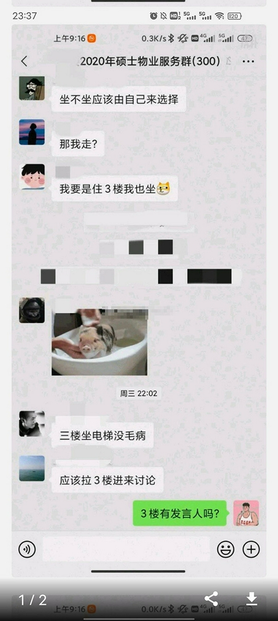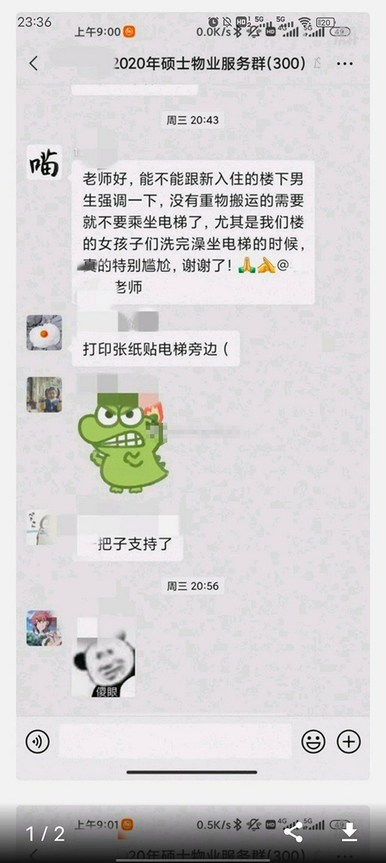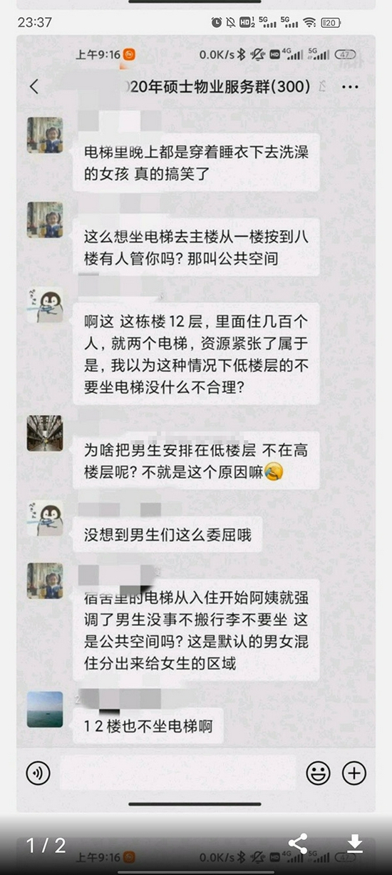 网传微信聊天记录显示,名为“2020年硕士物业服务群”的微信群内,有微信用户发言称“能不能跟新入住的楼下男生强调一下,没有重物搬运的需要就不要乘坐电梯了,尤其是我们楼的女孩子们洗完澡坐电梯的时候,真的特别尴尬,谢谢了!”