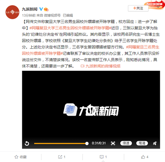 网传文件称复旦大学三名男生因校外嫖娼被开除学籍,校方回应:进一步了解中