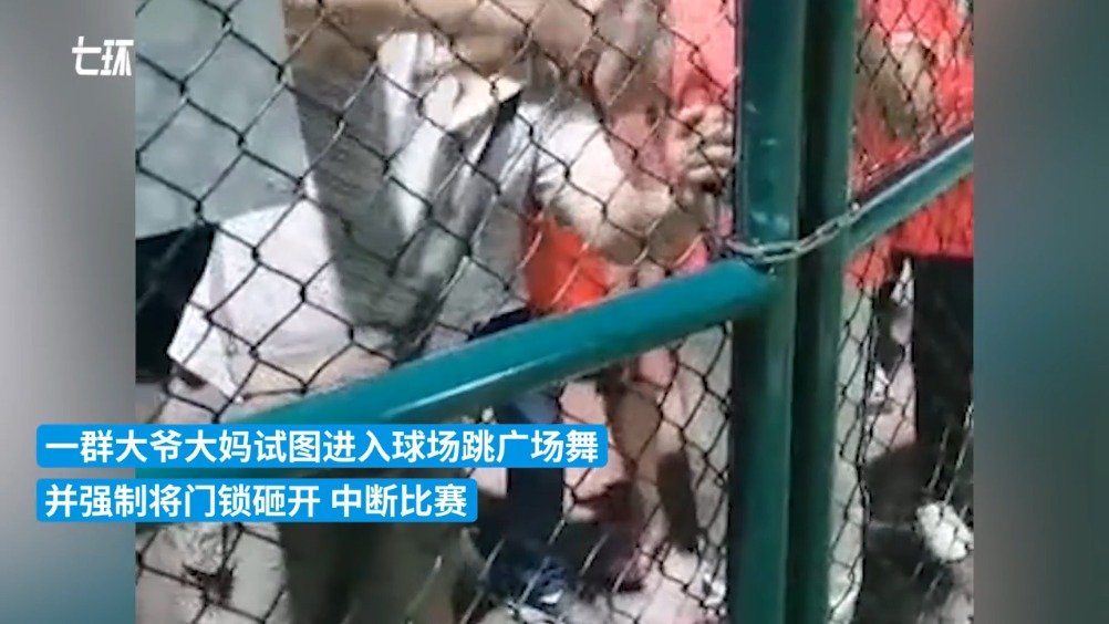 为跳广场舞大爷大妈砸门进足球场 小朋友们的比赛被强制中断