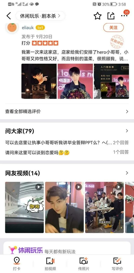 在大众点评App上,这家位于上海恒丰路的店铺被网友们称作网红店,它的页面几乎清一色是店内各种“男友”的视频和图片。网友询问最多的问题包括是否能让小哥哥去听毕业答辩、是否能陪去迪士尼、是否能陪写论文、是否可以陪打游戏、是否可以带出去吃饭等。