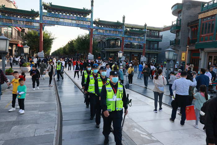 央视网消息:“今年10月1日那天,前门大街总共有超过20万人次游览参观,这是疫情爆发以来,人数最多的一天。”10月7日,即将完成国庆长假执勤任务的北京市公安局东城分局前门大街派出所警长张召龙说,今年国庆长假期间,前门大街非常热闹,“去年受到疫情的影响,前门大街人流量锐减,看到如今游客回来了,虽然我们的工作压力大了,但这说明一切都开始恢复疫情以前的状态了,感觉辛苦也是开心的。”