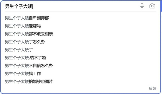 搜索引擎或许能发现端倪。搜索“男生个子太矮”,自动联想的词组往往是“自卑”、“抑郁”、“结不了婚”等词汇。事实上,之前还有一个新闻,长相俊朗的小哥哥,因为身高1米6,相亲被分手高达31次……