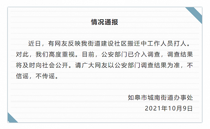 原标题:官方回应“网传江苏如皋一社区搬迁中工作人员打人”:公安部门已介入调查
