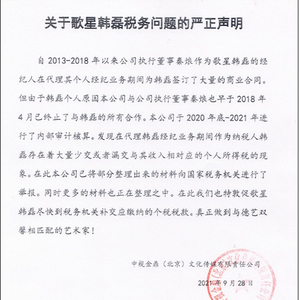 微博认证为“中视金鼎(北京)传媒有限责任公司”的官微@中视金鼎传媒 发布声明称,公司于2020年底-2021年进行了内部审计核算,发现在代理韩磊经纪业务期间作为纳税人韩磊存在着大量少交或者漏交与其收入相对应的个人所得税的现象。