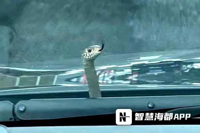 14日上午8:30左右,许女士福州市民许女士驾车从东江滨大道附近出发,准备去上班。谁知十多分钟后,当车驶到中亭街和台江路一带时,从车子的引擎盖与挡风玻璃之间的缝里,一条蛇探头探脑地钻了出来!