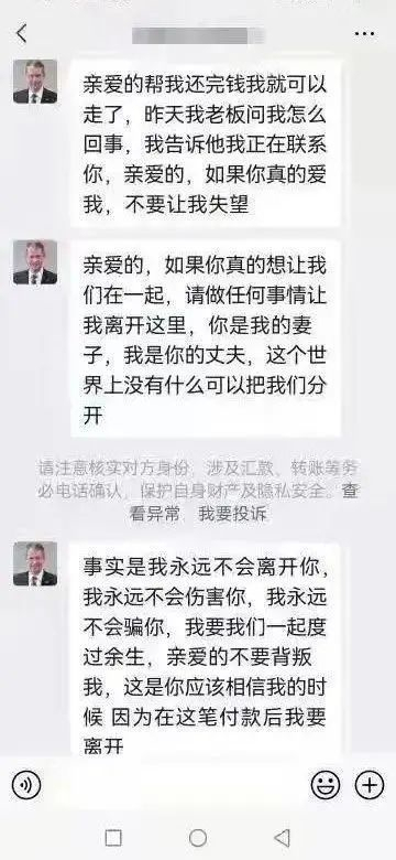 此后,罗伯特先后以“包裹有问题”,要支付“关卡费”、邮寄费等各种名目,多次要求朱女士转账,并花言巧语地欺骗道:“亲爱的,如果你真的想让我们在一起,请先让我离开这里。你是我的妻子,我是你的丈夫,这个世界上没有什么可以把我们分开……”